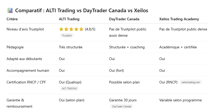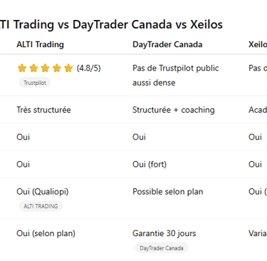 Les retours clients (comme ceux sur Trustpilot pour ALTI Trading ou les témoignages DayTrader Canada) sont des indicateurs précieux pour jauger la qualité pédagogique et le sérieux de la formation. (Trustpilot)